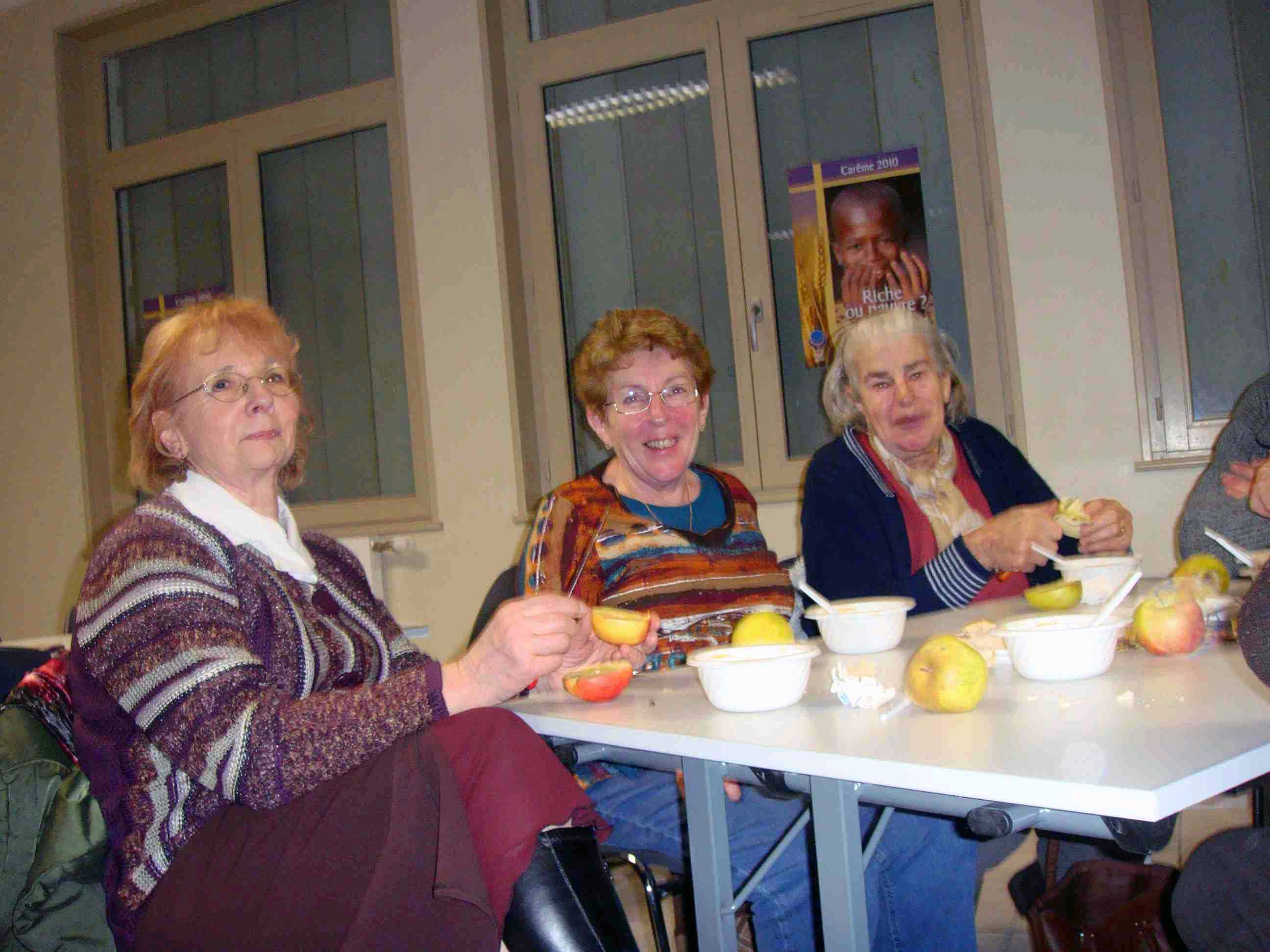 Claudette, Josette et Mme Brun dégustent les pommes